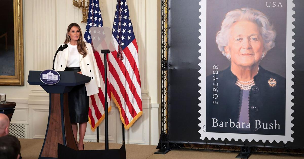 Fashion Notes: Melania Trump Wears Dior, Bespoke Hervé Pierre to Unveil Barbara Bush Postage Stamp