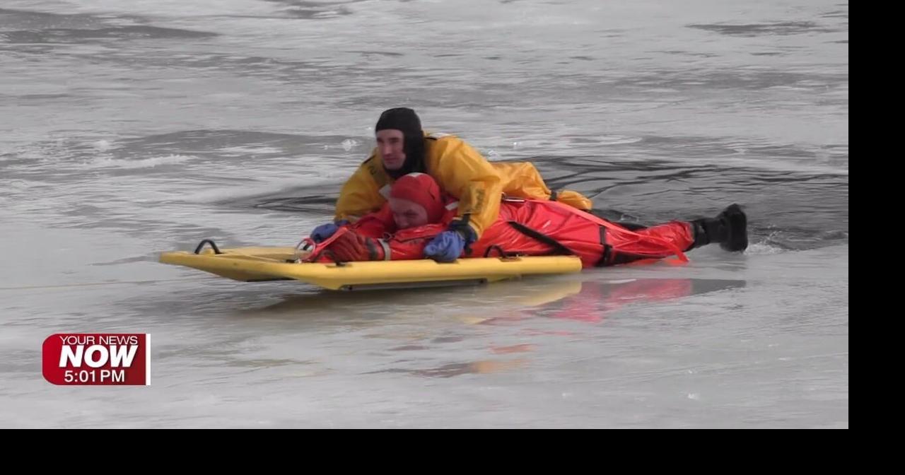 Lima Firefighters practice ice rescue techniques on Schoonover Lake